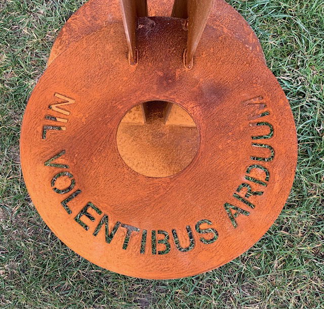 De titel ‘Nil volentibus arduum’ wat ‘Niets is onmogelijk voor hen die willen’ betekent is in samenspraak met de opdrachtgever in één van de rondingen in het staal uitgesneden.