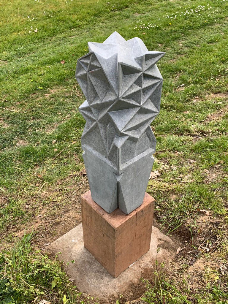 In de schaduwen van mijn Mikado objecten en de ruimten tussen de basaltkeien op de zeedijk naast m’n atelier, zag ik steeds de driehoeken. In diverse meetkundige uitingen heb ik deze toegepast in deze grijze zandsteen uit de buurt van Florence (IT). Met een mooie schaduw werking als gevolg.