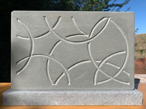 Aan de ene zijde een gebogen lijn ‘verhoogd’ en ‘over elkaar/onder elkaar door’ weergegeven door omliggende ruimte weg te beitelen. De andere zijde halve cirkels verdiept in de steen aangebracht.